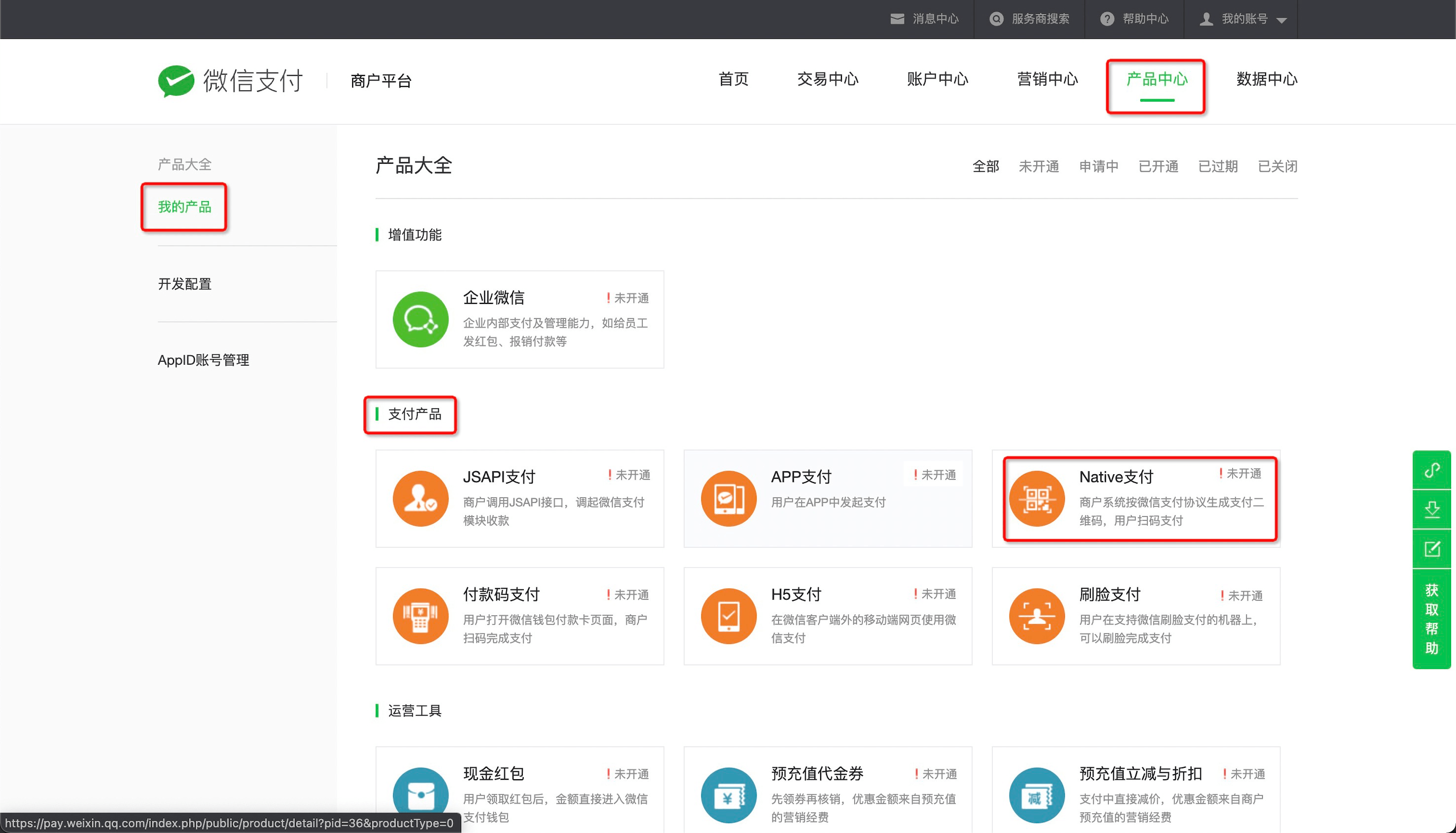 前往【微信支付商户平台】-【产品中心】-【我的产品】-【支付产品】中,申请开通【Native支付】。